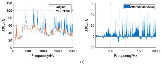 Average SPL frequency response curve in the cabin equipped with different MPP composite sound absorption structures (compared with the original wall plate). (a) Combined MPP. (b) MPP+Porous. (c) MPP+PAM.