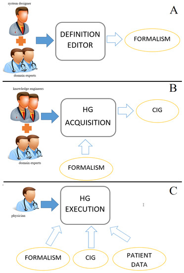 - the execution of a specific CIG on a specific patient (see Figure 2C). In such a phase, a physician (or a team of physicians) can take advantage of the HG_EXECUTION module to execute a specific CIG (acquired in a specific formalism) on a specific patient (e.g., to execute the ischemic stroke CIG on a specific patient—see Experiment 1).