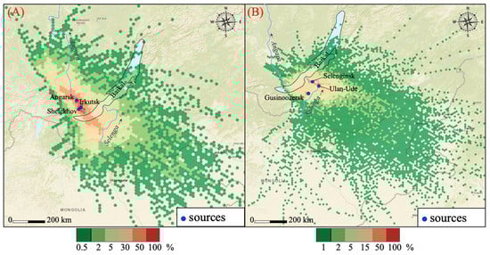 Percentage distribution of transfer pathways of air masses (250 m above ground level (AGL)), calculated from the main source cities of the Baikal region during 2017–2022 (A) Irkutsk Region (B) Republic of Buryatia https://www.ready.noaa.gov/HYSPLIT.php (accessed on 16 January 2023).