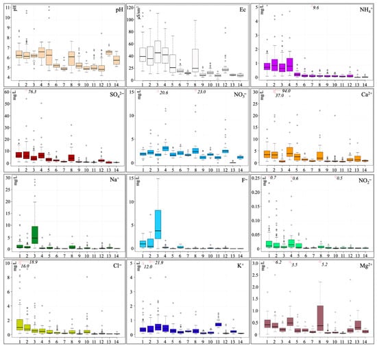 Concentrations of the main ions in the snow water of the Baikal Basin; Data analysis and discussion; Sampling area number: (1) Irkutsk; (2) Angarsk; (3) Shelekhov; (4) Ulan-Ude; (5) Selenginsk and Kamensk; (6) Irkutsk—Listvyanka; (7) Irkutsk—B. Goloustnoe; (8) Selenga delt; (9) Ulan-Ude—Kurumkan; (10) Southeast cost; (11) Baikal Nature Reserve; (12) Ice of South Baikal; (13) Ice of Middle Baikal; (14) Ice of Nothern Baikal. The diagram shows the median (thick line), the first quartile (Q1, the lower limit of the “box”) and the third quartile (Q3, the upper limit of the “box”), as well as one-time outliers being atypical values that fall out of the general series of observations and exceeding the limits of one and a half product differences between Q3 and Q1 (circles).