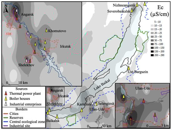 In order to understand the overall picture of soluble pollutants in the snow water of the Baikal Basin, the distribution of electrical conductivity was mapped (Figure 4). The map allowed estimating the acreage and pathways of transfer of emissions from industrial enterprises, as well as zoning the region according to the degree of soluble pollutants in water (aerosol load). As a result, increased levels of snow cover pollution were identified in cities as sources of pollution (Figure 4). The city of Angarsk, being the most prone to anthropogenic pollution, had an industrial zone with a length of more than 30 km and a total atmospheric emission of more than 110 thousand tons per year []. The atmospheric emissions from the Irkutsk agglomeration and the cities of Buryatia extended for tens of kilometers along the prevailing transfer pathway as well as along the main traffic flows and were locally determined near small settlements located on the coast. The plumes from industrial enterprises of the Irkutsk agglomeration were found on the ice of South Baikal in the area of Cape Kadilny (marked with an asterisk in Figure 4). The impact of emissions from the cities of Selenginsk and Kamensk, which are the sources of pollution in Buryatia, was visualized in the delta of the Selenga River (Figure 4).
