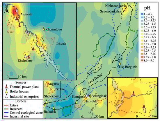 For determining the level of pollution by acidic components of the snow cover, a schematic map of the distribution of the pH value of the snow waters of the Baikal Basin was constructed (Figure 5). It is known that the pH value of atmospheric precipitation is mainly due to the presence of nitrogen, carbon, and sulfur oxides in the atmosphere. The pH value of atmospheric precipitation in the background regions of the world is 5.1–5.5 []. In the cities of the region, where alkaline aerosol particles (ash) from coal-fired thermal power plants are emitted into the atmosphere, the pH value varied from 6.25 to 7.75. High pH values varying from 11.05 to 11.07 units were determined in snow water near cement production enterprises (Angarsk, Kamensk). Acid atmospheric fallout (pH~4–5) was identified in the snow water of Southern Baikal and in the area of the Baikal State Biosphere Reserve (4.7). The lowest values (4.44) were recorded on the ice of Southern Baikal (Kadilny-Mishikha cape), which could be associated with the transfer of sulfur and nitrogen oxides from large thermal power plants located in the valley of the Angara River. The rest of Baikal (districts 12–14) had pH values varying from 5.25 to 6.5 (Figure 5).