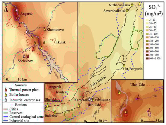 Schematic map of the spatial accumulation of sulfate ion (SO42−) in the snow cover of the Baikal basin.