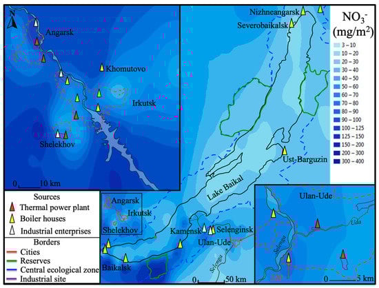 Schematic map of the spatial accumulation of nitrate ion (NO3−) in the snow cover of the Baikal basin.