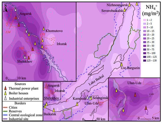Schematic map of the spatial accumulation of ammonium ions (NH4+) in the snow cover of the Baikal basin.