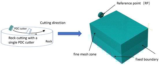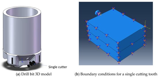The finite element analysis of the cutting tooth-rock model was conducted using the abaqus2021 program. The individual cutting tooth of the drill has a diameter of 5 mm and a height of 3 mm. Following the Saint Venant principle [27], the size of the rock model is typically 3–5 times larger than the cutting tool, resulting in a rock size of 40 × 30 × 20 mm. The dimensions of the cutting tooth composite and the rock model can be seen in Figure 5 below. The boundary conditions for the 3D cutting diagram and simulation are shown in Figure 5.