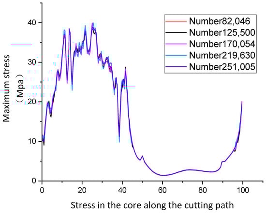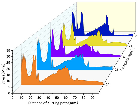 By utilizing the post-processing function in ABAQUS 2023, the stresses at the outermost edge of the core were derived for different inclination angles, and the variation of residual stresses with the cutting path for different inclination angles is shown in Figure 10. Different colours represent different cutting angles. As observed in Figure 10, the area of direct contact with the cutting teeth experiences the highest stress levels. Furthermore, the cores obtained after cutting display a concentration of residual stresses at the edges, which consequently impacts the fidelity of the cores [32,33]. These findings align with the residual stress patterns identified in the theoretical analysis.