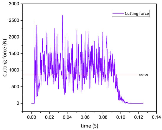 As can be observed from the graph, the cutting forces exhibit significant fluctuations over time. This is attributed to the rock reaching its yield limit, leading to fracture damage. Specific units fail to absorb plastic deformation energy, resulting in a rapid decrease in cutting force. However, to proceed with the cutting process for the subsequent division, the cutting force experiences a rapid increase once again. Throughout the cutting process, while maintaining a constant depth of cut, the tangential and axial forces fluctuate within a specific range. Nonetheless, there is an underlying stable average value. By utilizing this average value as the representative tangential and axial forces, the average cutting force at a back-rake angle of 15° is determined to be 822.5 N. In the ABAQUS 2023 post-processing, the X-directional support force CFN2 at the RP point, which is attached to the rigid body, is extracted [29,30]. This force represents the tangential force exerted by the cutting tooth on the rock, reflecting the cutting force of the cutting tooth under actual working conditions. CFN2 values are extracted at various time points (i) after contact between the tooth and the rock to determine the average cutting force. The average cutting force is then calculated using the following equation: