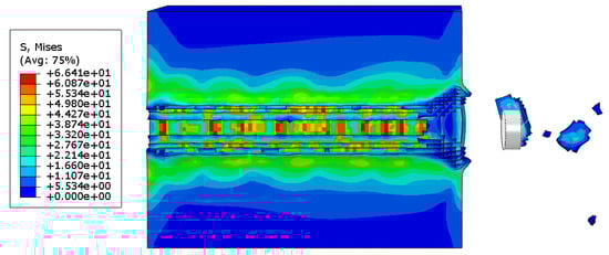 During the vibration of the drill cutting corer, the core experiences stress that does not meet the fidelity performance requirements. The cutting teeth create localized force concentrations near the contact points during cutting, leading to plastic deformation of the rock, mostly at the point where the cutting teeth are in direct contact with the core, which is consistent with the results of the theoretical model. To enhance core fidelity, it is crucial to identify the area where the maximum stress point is located and minimize the peak value of this stress point, as shown in Figure 9.