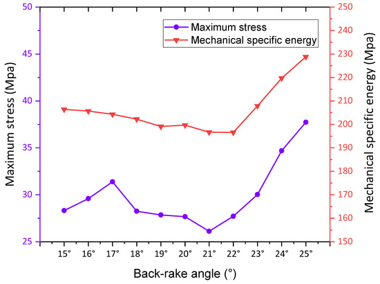 Maximum stress and MSE values with back-rake angle.