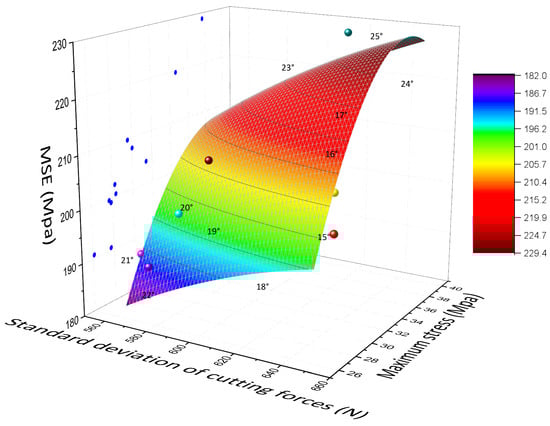 The x-axis represents the standard deviation of the cutting force at a back-rack angle of 15–25°, while the y-axis represents the stress at the outermost edge of the core at different dip angles. The z-axis corresponds to various cutting angles’ MSE values. These variables are used to create a scatter plot, and a surface is fitted to the data in the XYZ-axis.
