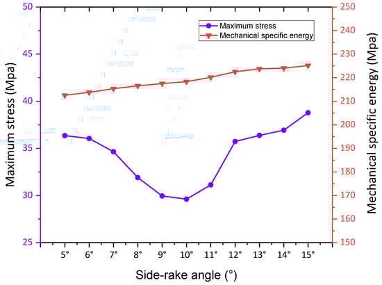 Maximum stress and MSE values with side-rake angle.
