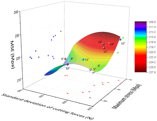 As shown in Figure 15, the x-axis represents the standard deviation of the cutting force at a side-rack angle of 5–15°, while the y-axis represents the stress at the outermost edge of the core at different dip angles. The z-axis corresponds to various cutting angles’ MSE values. These variables are used to create a scatter plot, and a surface is fitted to the data in the XYZ-axis.