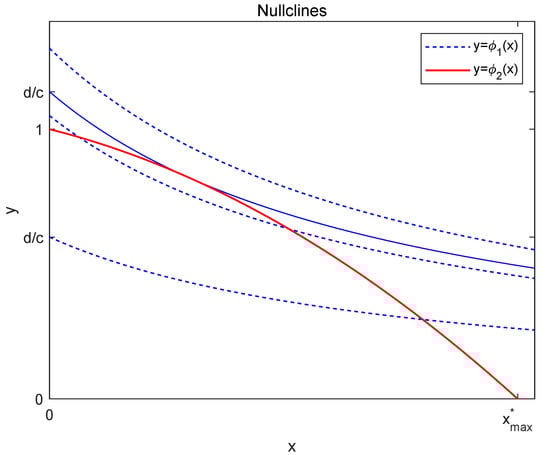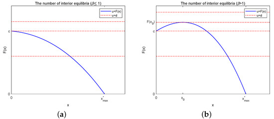 Clearly, . Therefore, we only need to discuss the positive intersection point of the functions and . When there are two interior equilibria, the larger one of the predator is denoted as , and the other one is denoted as .