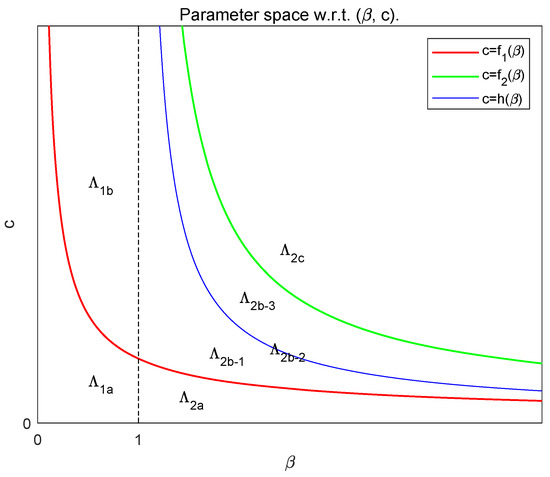 Based on (17) and (18), we divide the parameter region into the following two subregions (see Figure 3):