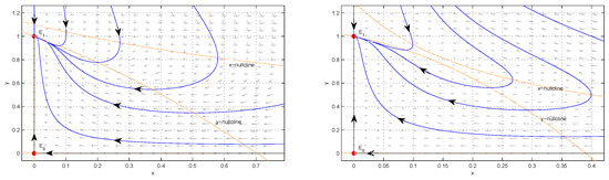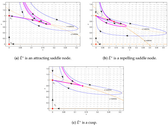 For the scenario , the Hopf bifurcation curve intersects the line (see Figure 5b) so the Hopf bifurcation and the saddle-node bifurcation occur simultaneously at . In this scenario, the coexistence of two species exhibits only an oscillatory mode for (see Figure 11a). When , (3) has no limit cycle, two attractors and (bistability) appear, and the coexistence of the two populations depends on the initial values (see Figure 11c).
