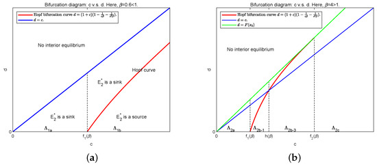 In (6), the sign of the coefficient is important for determining the graph of the function and the range of the parameter d such that System (3) has zero, one, and two interior equilibria. So, we choose d as the bifurcation parameter. Based on the sign of , the coefficient of the first-order term of , we divide the parameter space given in (4) into