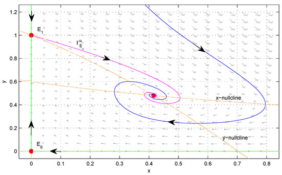 - is a stable node if either or and , whereas it is a saddle if , with its stable manifold along the y-axis and its unstable manifold (denoted by ) entering the interior of . If and , is a saddle node: