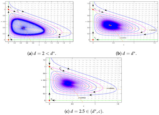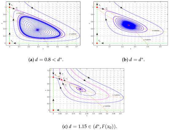 - When d is large such that , System (3) has two attractors: one is the boundary equilibrium and the other is the stable limit cycle surrounding . The separatrices of the attracting basins of these two attractors are the stable manifolds and of the saddle (see Figure 12b). As d increases from c to , the attracting basin of the limit cycle dwindles and eventually shrinks into a homoclinic loop of (see Figure 12c). So, when , the coexistence of the prey and predator depends on the initial values.