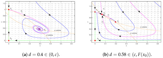 For the case , Theorem 10 indicates that when the mortality of the predator is small (), both species coexist (see Figure 9a). When d is large such that , System (3) has no limit cycle and there are two attractors: and (bistability). The separatrices of the attracting basins of and are the stable manifolds and of the saddle (see Figure 9b). So, when , the coexistence of the two populations depends on the initial values. As d becomes larger (), System (3) only has the attractor ; the predator becomes extinct and the prey survives (see Theorem 7 and Figure 6b).