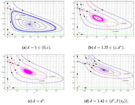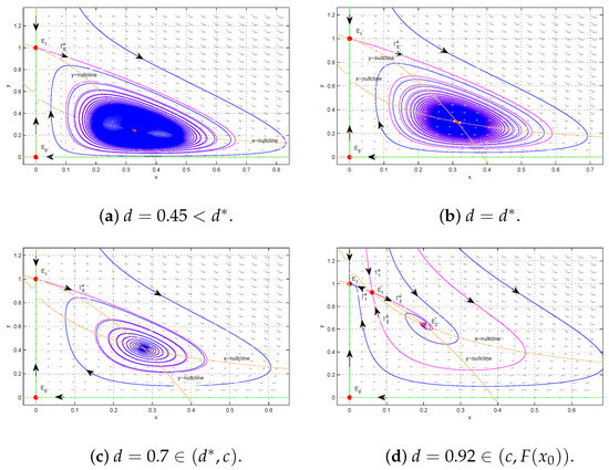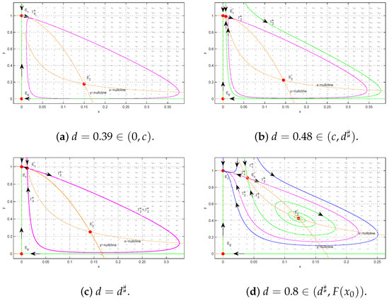 Figure 10. The dynamics of System (3) as in the case . Here, , . The Hopf bifurcation value . In (a), and is a source and surrounded by a stable limit cycle. In (b), and a backward and supercritical Hopf bifurcation occurs. In (c), and is globally asymptotically stable. In (d), and there are two attractors and (bistability).- (ii)