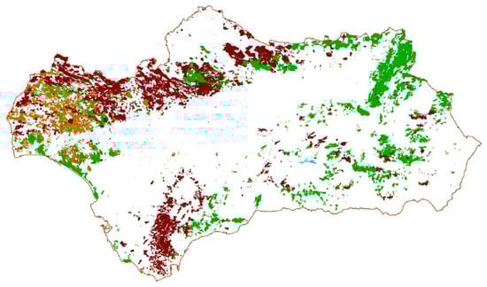 Forest biomass production in Andalusia (green: pinus, orange: eucalyptus, brown: quercus) [].