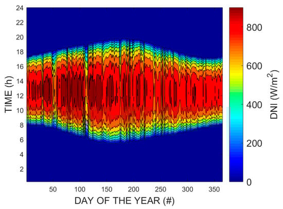 Direct normal irradiance (DNI, W/m2) of the design year.