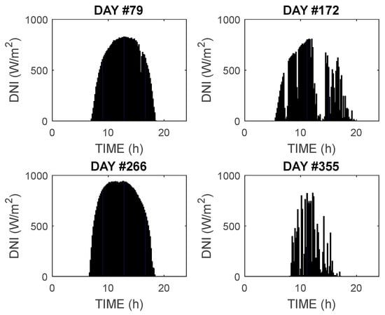 Once the exact location of the hybrid plant under study was determined, a typical design year was developed based on the information available in the NSRDB (NREL) [,], which provides representative values of various meteorological variables. Among these variables, direct normal irradiance (DNI) is worth noting, and its annual evolution is shown in Figure 3. The typical design year had a resolution of 10 min, as can be observed in Figure 4, which displays the temporal evolution of DNI for the four days corresponding to the two equinoxes and the two solstices. Lastly, the typical design year revealed an annual direct normal irradiation of 2150 kWh/m2 with an uncertainty of less than 10%, making it highly suitable for the implementation of a CSP plant.