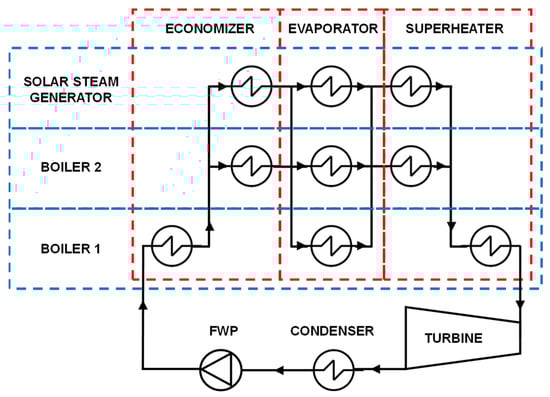 The present study constitutes a techno-economic analysis of a 2 MW CSP-biomass hybrid plant. The uniqueness of the analyzed plant lies in the fact that the thermal energy from the solar field, consisting of parabolic trough collectors, is complemented by biomass combustion through a mixed configuration (Figure 5). Thus, the mixed hybridization consists of both a series scheme (Boiler 1), aiming to improve the quality of generated steam, and a parallel scheme (Boiler 2), designed to absorb solar resource fluctuations.