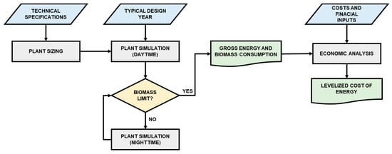 The objective of this study was to assess the economic viability of a CSP-biomass hybrid plant based on an innovative series/parallel-process scheme. The hypothetical power plant analyzed in this work had a capacity corresponding to a small scale, with a chosen gross generation capacity of 2 MW. This study was structured into three parts. First, the materials and methods applied in this work, including the influence of the selected location, technical plant characterization, and economic analysis details, are presented. Next, the obtained results are analyzed, encompassing daily simulations, annual balances, and the calculation of the LCOE. Finally, the conclusions drawn from this analysis are presented.