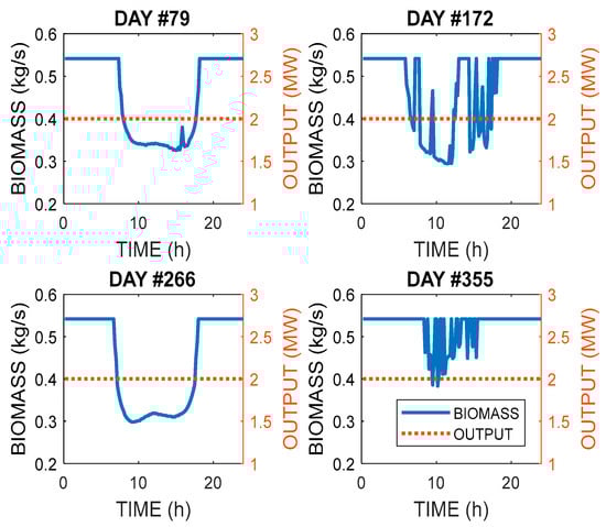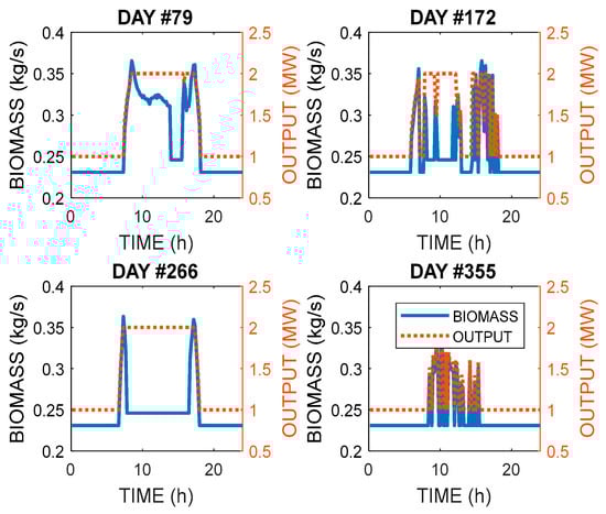 Hourly evolution of biomass consumption (kg/s) and gross electric power generated (MW) for the four representative days (SM = 1, BFF = 50%).