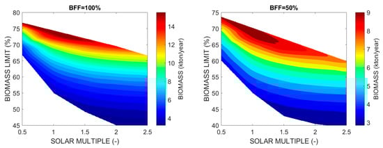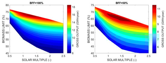 Figure 9 and Figure 10 show the annual biomass consumption (kton/year) and gross electric energy generated (GWh/year), respectively, as a function of the SM and the biomass consumption limit for the two considered BFF values. Firstly, it is worth noting that for any of the displayed graphs, the upper white area is delimited by the extreme case corresponding to the maximum allowable hours of annual operation. On the other hand, the lower white area corresponds to the limit derived from the impossibility of biomass consumption during nighttime operation. In both figures, it can be observed that within the analyzed ranges, both biomass consumption and energy generation increase with increasing SM or the limit of the maximum fraction of energy generated from biomass, regardless of the BFF value. The increase in both variables with increasing SM is not only due to the greater contribution of thermal energy from the solar field but also, given a biomass consumption limit, a higher solar production enables a greater generation of electricity from direct biomass combustion, which increases both the biomass consumption and the annual electricity generated. Regarding the influence of the BFF, when it is lower, both annual biomass consumption and gross electric energy production are lower due to the increased hours of operation at partial load.