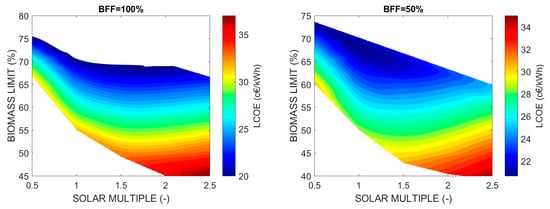 On the other hand, it was found that in contexts with limitations on biomass contribution, opting for the BFF = 50% configuration is more cost-effective (Figure 13). However, it was demonstrated that the existence of limits on biomass contribution negatively impacts the resulting LCOE. Considering the realistic scenario where biomass contribution was limited to 50%, an optimal configuration (SM = 1.5 and BFF = 50%) was identified where the LCOE reached a value of cEUR 27.93/kWh, which is very high compared to market values.