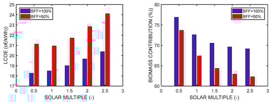 Since, as shown in Figure 11, for the two considered values of BFF, the optimal LCOE corresponded to the extreme case associated with the absence of biomass consumption limits, Figure 12 presents the LCOE (cEUR/kWh) as a function of the SM in this scenario, as well as the biomass contribution (%) to annual electricity production. Under such circumstances, it can be concluded that lower BFF values resulted in a higher obtained LCOE. In other words, the lower investment and operating costs associated with the configuration with BFF = 50% failed to compensate for the lower annual electricity production. Additionally, it should be clarified that, given a BFF value, the SM value that optimized the LCOE did not correspond to 1.5, contrary to what was indicated earlier. This is because Figure 12 compares cases with different biomass contributions (Figure 12 right), whereas the SM = 1.5 optimum corresponds to constant biomass contributions.