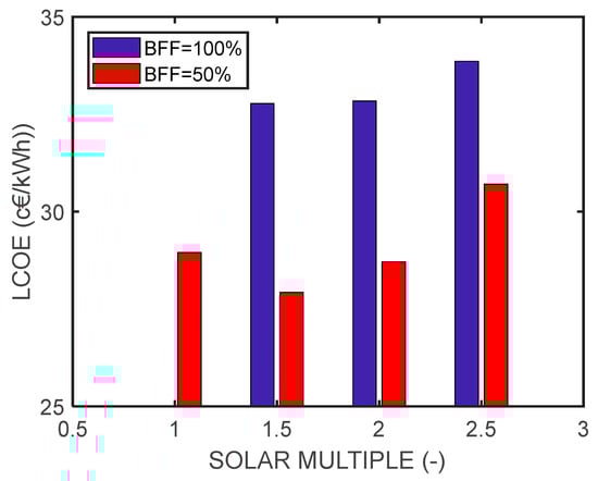 However, the previous scenario where there are no limits on biomass contribution to annual electricity production is not representative of legal frameworks that prioritize renewable energies and provide incentives. In these situations, solar contribution is usually prioritized over biomass. As mentioned in Section 3.2, this is achieved by establishing a limit on biomass consumption, with a 50% limit being quite representative. For this reason, Figure 13 shows the LCOE (cEUR/kWh) as a function of SM for a 50% biomass contribution limit. It can be observed that for the BFF = 100% configuration, there is no case of SM = 1, as the minimum biomass contribution was 55%, which exceeded the maximum limit of 50%. As mentioned in the analysis of Figure 11, the first conclusion drawn from comparing Figure 12 and Figure 13 is the increase in LCOE resulting from the establishment of limits on biomass contribution. However, unlike Figure 12 and Figure 13 highlights that in contexts with limitations on biomass consumption, the BFF = 50% configuration was more cost-effective. This is justified by the fact that the limitation on biomass contribution results in periods of shutdown for the hybrid plant. In this situation, the lower investment and operating costs associated with the BFF = 50% configuration compensated for the lower annual electricity production, making this configuration more attractive. Finally, it can be observed that for the BFF = 50% case, the optimal LCOE was achieved with SM = 1.5, as previously indicated for cases with the same biomass contribution limit.