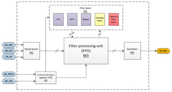 Table 1 describes the type and functionality of all the filtering module signals. The ASIC can be seen as an I2S filtering unit. The module receives a 16-bit serial stereo input and should output a signal with the same format; therefore, there is a deserializer (M2) saving the serial input in the inner registers, and the input values in said registers will be filtered (M3) based on the selected filters from the filter bank (M1), which can be written through an independent I2C interface (M5); finally, the output values will go through a deserializer (M4), returning it to its original format. Both I2S_ADC and I2S_DAC, input and output, respectively, will share the same control signals, I2S_CLK and I2S_LR. The output is synced with its corresponding LR input; the timing and input–output delay based on each filter mode can be seen in Figures 5 and 6.