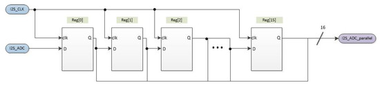 Figure 3 shows the signal processing data path for a deterministic mono filter. Once the data are deserialized to a 16-bit word, they enter the first stage, which consists of a 16-stage shift register, and the previous data move forward in the register chain when there is a positive edge from the left–right data selector.