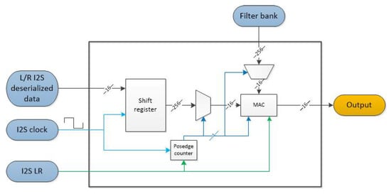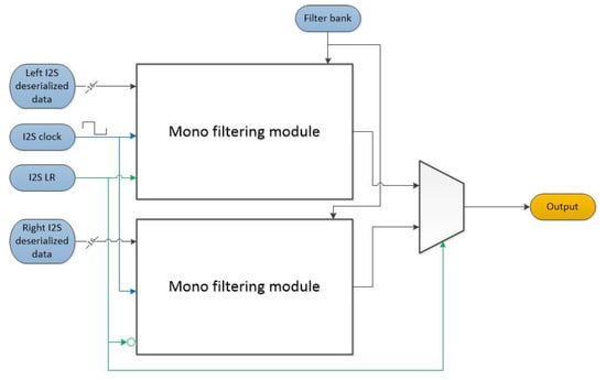 When the left–right data selector is low, a single step of the convolution between the input data in the shift register and the filter bank coefficient is performed in the multiply–accumulate (MAC) unit. This filtered signal, after 16 clock edges, will be again serialized in the next stage. Figure 4 describes the complete stereo filtering diagram constructed with two mono filtering modules, where the right and left channels are multiplexed based on the value of the I2S LR signal. It is important to note that, with these features, the stereo filtering module is I2S-compliant.