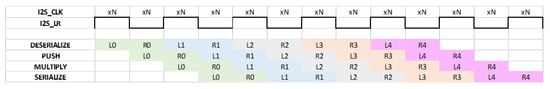 Figure 5 and Figure 6 show the user-defined/adaptive filtering processes’ timing, respectively. The top signals can be found in both deterministic FIR filtering and adaptive filtering; I2S_CLK and I2S_LR are the main control signals, where I2S_CLK is the general clock signal and I2S_LR is the left–right synchronization signal; if high, the left channel data are provided by the ADC and the output DAC taken by the DAC, whilst the low state selects the right channel.