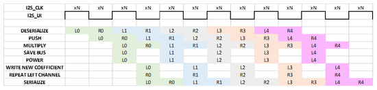 The subsequent highlighted values represent the processes needed for both FIR user-defined and adaptive filtering, respectively. The nomenclature used in the diagrams to differentiate left from right channel processing over time is given by: [channel][number of data]. The channel can be either L (for the left channel) or R (for the right channel). The number of data starts at zero, representing the beginning of the data frame and the increments per each positive edge of the I2S_LR, which indicates the start of the next data for both channels. For example, if an L3 is in the deserialization row, it means that the third left data will be processed by the deserialization module for 16 I2S_CLK cycles or half a cycle from I2S_LR in the time given by the column intersection.