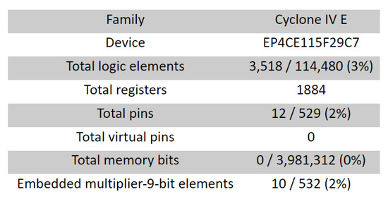 The design was implemented in the Verilog hardware description language with Intel FPGA technology. The register transfer level (RTL) architecture in Verilog of every module, the functional verification, the timing diagrams, and additional material are described in [10]. Figure 7 corresponds to the Intel-Quartus fitter report, which shows the summary of the required logic elements, registers, multipliers, and pins that form the project, with a specific FPGA.