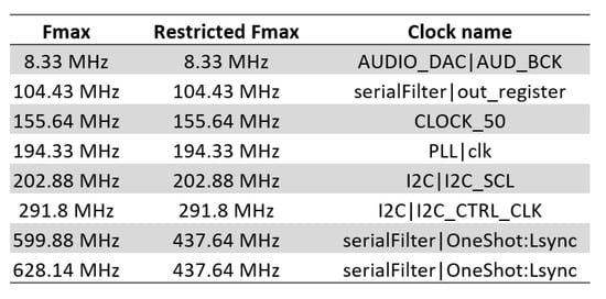 The Cyclone IV FPGA used to emulate the hardware had enough resources for this specific design using only 3% of the total logic elements, 2% of the total embedded multipliers, and no memory bits; instead, the entire design can be achieved by using only registers. Although the entire project can be developed with only 10 multipliers, these are the most-area-consuming cells in the entire project, and this is a critical parameter for the physical implementation. The information shown in Figure 8 was used in the VLSI implementation as the timing requirements; the maximum input frequency, considering 44.1 kHz as the sample rate with a 16-bit stereo input, was 1.4112 MHz; this timing analysis ensured that every critical path can be synthesized.