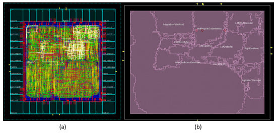 The abstract physical design was exported to the Virtuoso tool to carry out the final verifications such as layout versus schematic (LVS) and design rule checking (DRC). Furthermore, the graphic design system (GDS) file was generated with Virtuoso to send this file to the foundry. The chip physical design and the floor plan of the design modules are shown in Figure 9a,b, respectively.