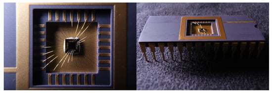 The pinout of the chip was as follows: serialIn, clk, rst, SDA, sideSelector, serialOut, SCL, vdd, vss (core power supply, 1.8 V), dvdd, and dvss (3.3V I/O power supply). In order to handle more than the required current for the core and to close the pad ring, extra vdd, vss, dvdd, and dvss pads were added to the remaining pins of the dual in-line (DIP) 28 package. The ASIC implementation shown in Figure 10 was manufactured by EUROPRACTICE IC Service using TSMC’s 180 nm CMOS technology.