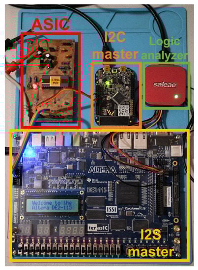 A PCB was designed in order to supply power to the package, connect to the I2S and I2C buses, and test the ASIC in an environment close to its real-world application. The test environment shown in Figure 11 consisted of: