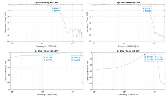 The filter bank considered four types of filters: There were two low-pass filters with an equivalent cut-off frequency of 1.894 kHz and 3.875 kHz; these filters were intended for low-/low–mid-frequency filtering. There were two band-pass filters of 1.033 kHz–19.035 kHz and 4.478 kHz–9.474 kHz; these filters were intended for mid-/mid–high-frequency filtering. It can be observed that the true cut-off frequencies had a slight deviation from the theoretical design. Finally, the testing of the adaptive filter was approached by using a spectral density estimation of the recorded data.