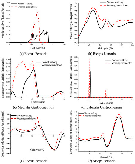 The muscle contraction velocity is a good indicator of the amount of muscle force. As is shown in Figure 7e–g, compared with the human-only model, for the human-exoskeleton model, the maximum contraction velocity of the Rectus Femoris increased by 159.86 mm/s, the maximum contraction velocity of the Biceps Femoris increased by 9.18 mm/s, and that of the Semitendinosus remained unchanged. In addition, the maximum contraction velocity of the Medialis Gastrocnemius and Lateralis Gastrocnemius muscles increased by 46.68 mm/s and 38.24 mm/s, respectively, through the analysis of the results (Figure 7i,j). The muscle contraction velocity of the Tibialis Anterior muscle lagged by 8% gait cycle, but the maximum contraction velocity increased by 28.17 mm/s, as shown in Figure 7h.