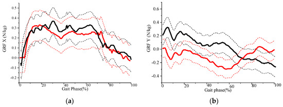 GRF and COP trajectory analysis. (a–c) SSP subjects-exoskeleton model mass normalized predicted GRF (the black thick line is the mean and the black dotted lines are the mean ± standard deviation) and human-exoskeleton model GRF (the red thick line is the mean and the red dotted lines are the mean ± standard deviation); (d,e) SSP subjects-exoskeleton model predicted COP trajectories (the black thick line is the mean and the black dotted lines are the mean ± standard deviation) and human-exoskeleton model COP trajectories (the red thick line is the mean and the red dotted lines are the mean ± standard deviation).
