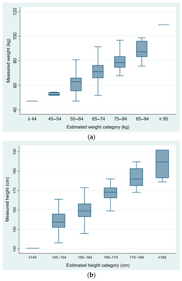 - Gorber, S.C.; Tremblay, M.; Moher, D.; Gorber, B. A comparison of direct vs. self-report measures for assessing height, weight and body mass index: A systematic review. Obes. Rev. 2007, 8, 307–326. [Google Scholar] [CrossRef]