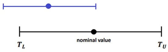 For , the tolerance interval is within the acceptance interval (Figure 2a). This is the case of the minimization of the global producer’s risk. For , it holds that (Figure 2b). The acceptance interval is within the tolerance interval for (Figure 2c). This is a model of minimization of the global consumer’s risk.